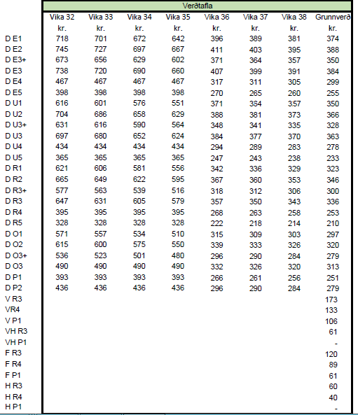 Hér að neðan er til glöggvunar verðskrá haustsins að viðbættu 8% álagi.